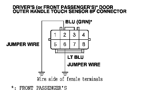 12. Connect driver's (or front passenger's)* door outer handle touch sensor 8P connector terminals No. 2 and No. 6 to body ground with jumper wires.