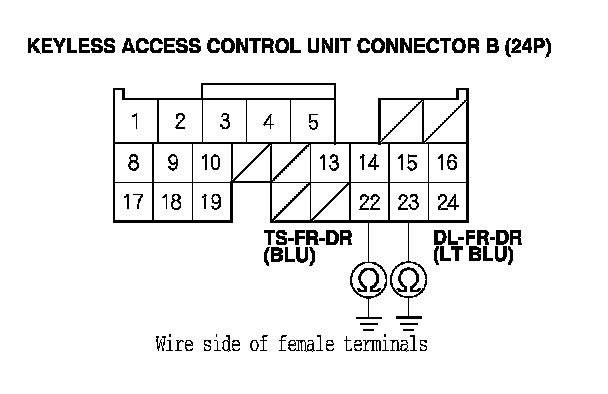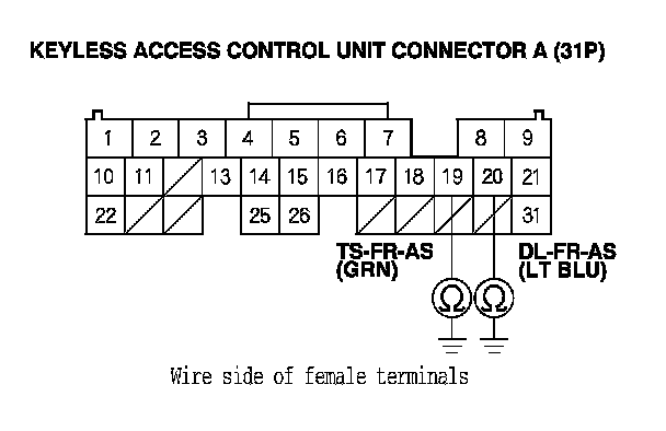 13. Check for continuity between keyless access control unit connector A (31P) terminals No. 19 and No. 20 and body ground (for front passenger's door touch sensor) or between keyless access control unit connector B (24P) terminals No. 22 and No. 23 and body ground (for driver's door touch sensor).