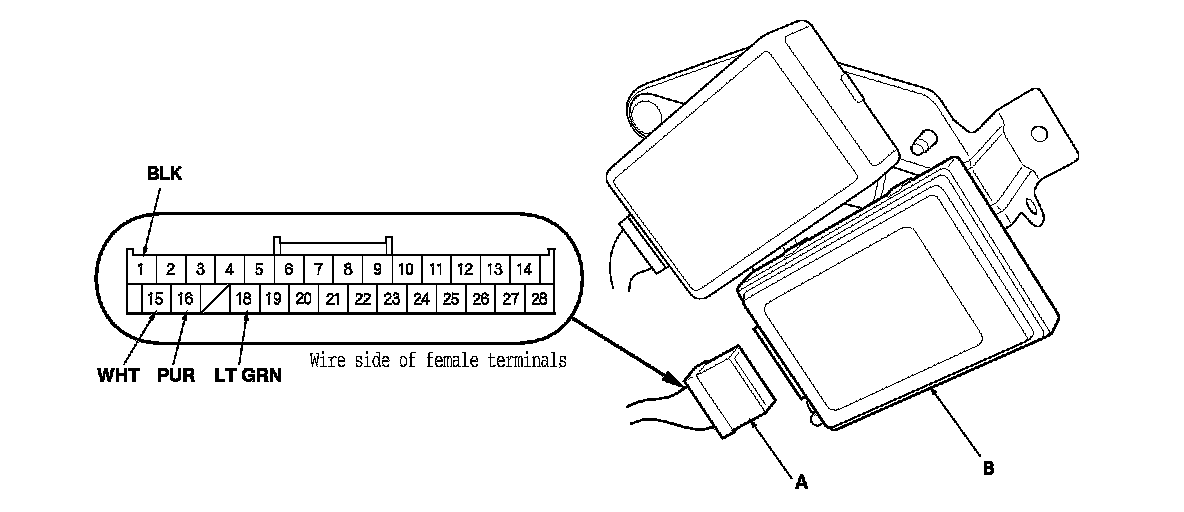 2. Disconnect the 28P connector (A) from the HandsFreeLink control unit (B).