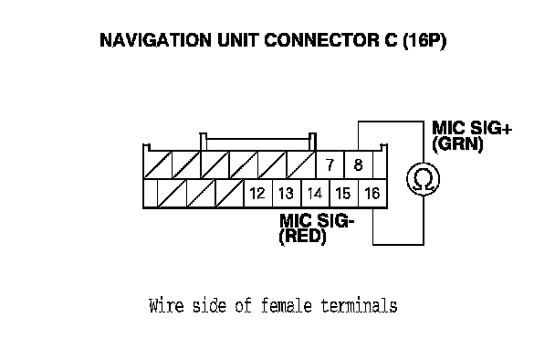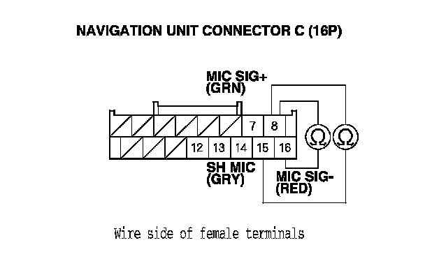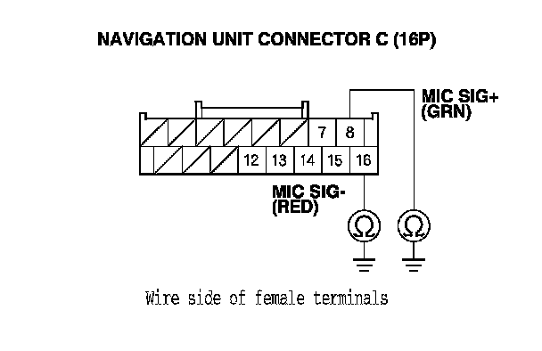 11. Check for continuity between navigation unit connector C terminals No. 8 and No 15, and between terminals No. 8 and No. 16.