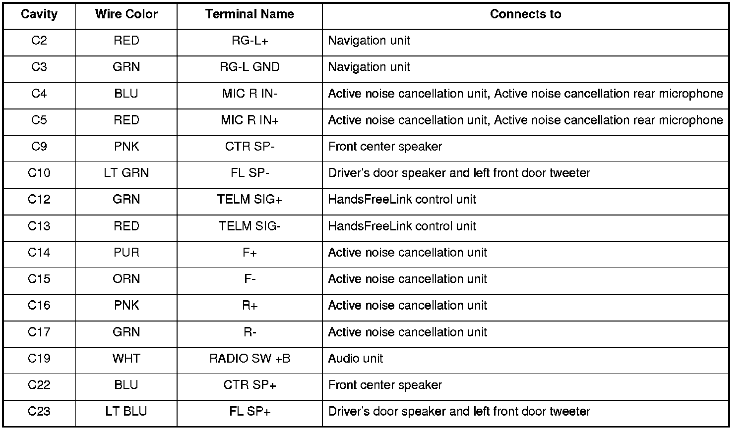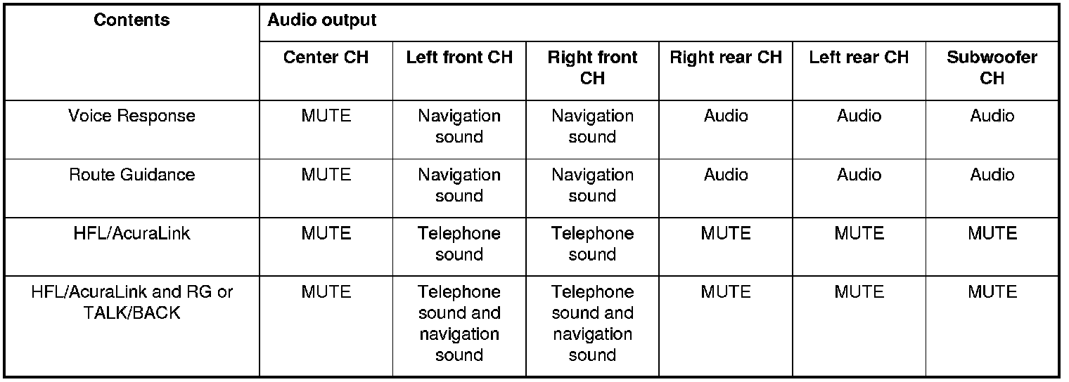 The optional navigation system provides voice control for the front/rear audio, the XM, and the CD player. Voice control commands are communicated through the GA-Net (audio unit). When using the TALK/BACK or route guidance (RG), only the center speaker is muted and the front speakers give the navigation instructions. When using the HFL/AcuraLink, the center speaker, the rear speakers, and the subwoofer are muted and the front speakers give the telephone sound. When using the HFL/AcuraLink and the RG (Route Guidance) or voice response, the center speaker, the rear speakers, and the subwoofer are muted and the front speakers give the telephone sound and the navigation instructions. Muting commands are passed on the GA-Net bus. For more information, see the navigation section. The outline of the audio interruption function is shown in the following table.