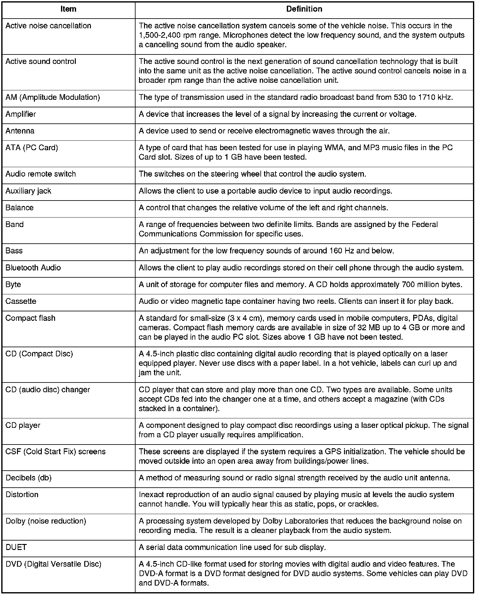 The audio unit acts as the processor for all audio functions. You can select the audio functions from the front panel, the audio remote (on steering wheel), or by using the navigation voice control system. The audio display provides the current front and rear audio status. For vehicles with the navigation option, additional audio information is available by touching the audio button. (See the owner's manual for more details.)