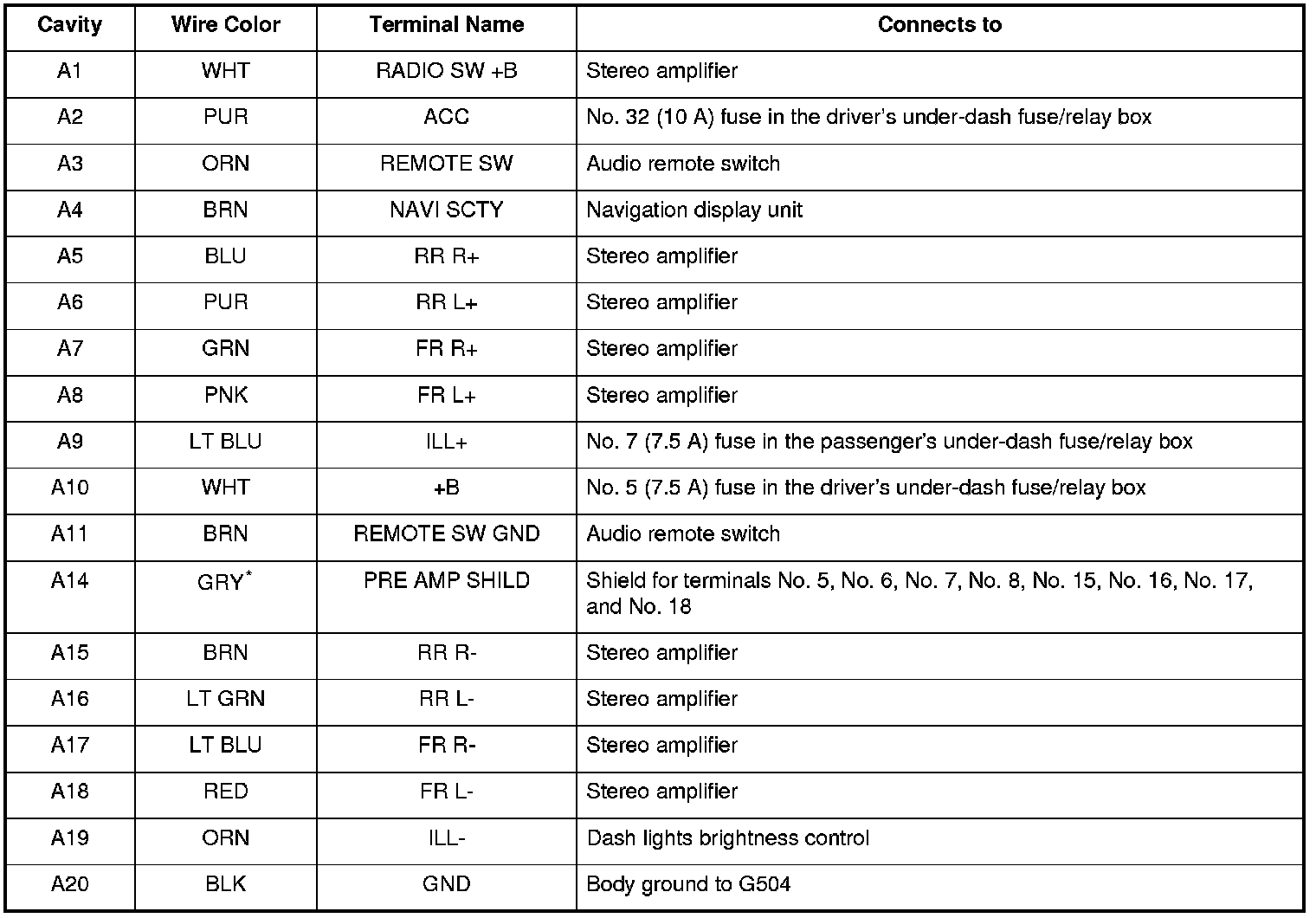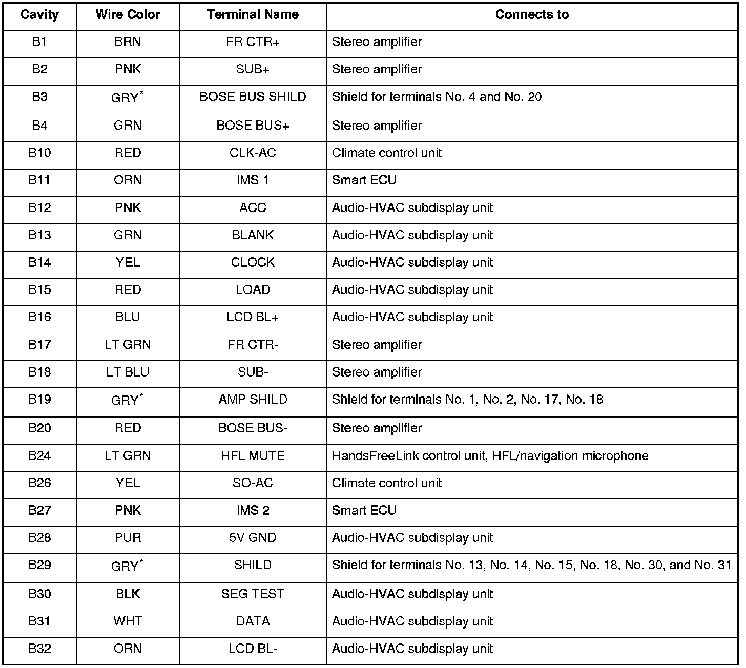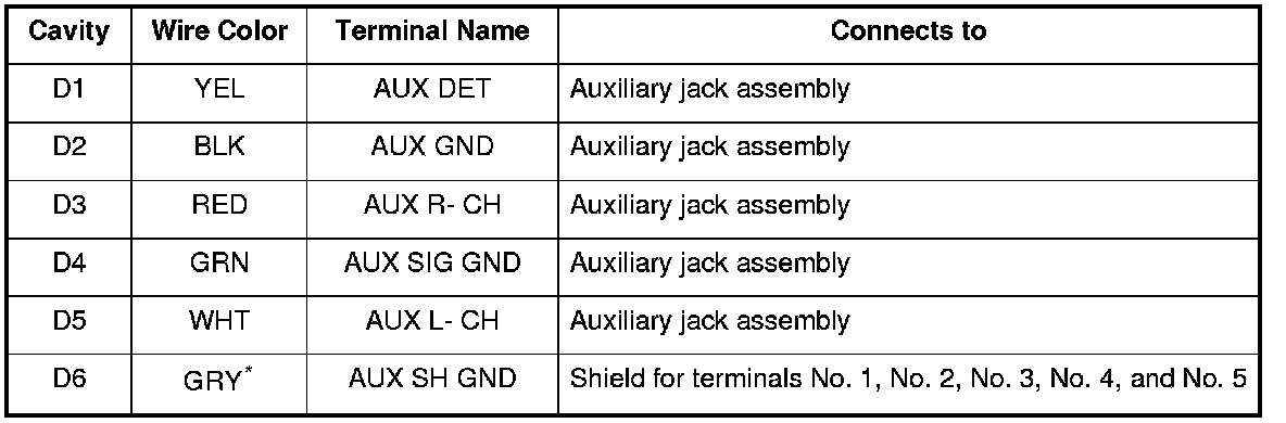 *: The shielded wires have a heat-shrink tube insulating the outside of the wire. The color of the insulating tube, typically black or dark gray, may not match the color of the wire listed on the schematic.