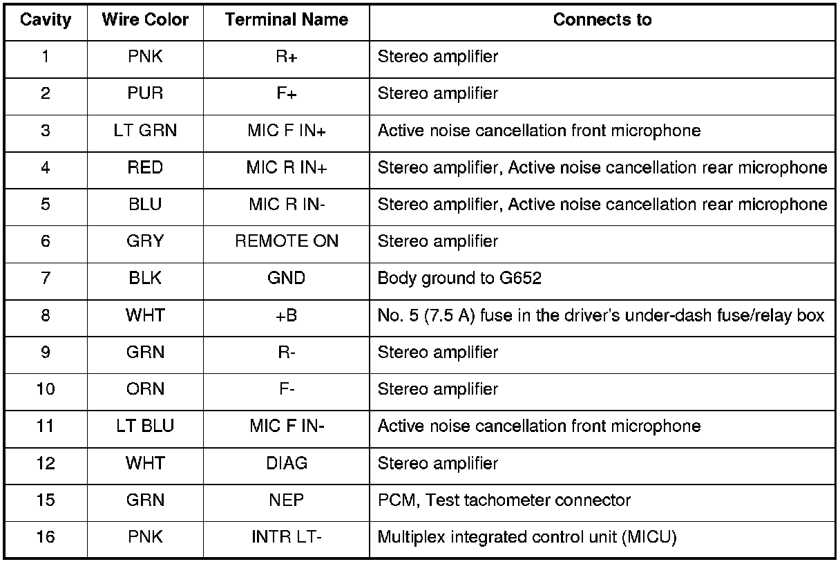 The active noise cancellation system works to cancel engine booming sound up to 2,000 rpm. The audio unit receives the engine speed pulse (NEP) from the PCM and outputs a sine wave through the audio speakers to cancel the low frequency sound from the engine. The active noise cancellation also uses the two microphones to detect and monitor low frequency sound noise in the passenger compartment. The microphones feed information back to the audio unit which adjusts the speaker output to reduce the noise. The active noise cancellation also receives an input from the door open/close (INTR LT) signal from the MICU so that when a door is opened, the active noise cancellation system temporarily stops working.