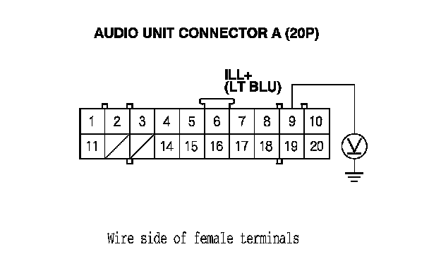10. With the headlight switch still on, measure the voltage between audio unit connector A (20P) terminal No. 9 and body ground.