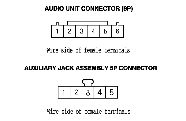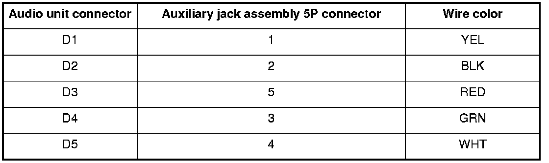 12. Check for continuity between audio unit connector D (6P) and auxiliary jack assembly 5P connector according to the table.