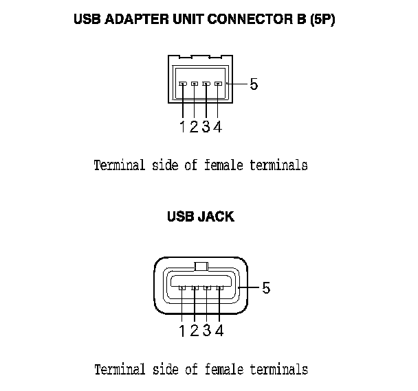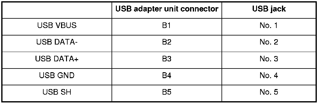 8. Check for continuity between USB adapter unit connector B (5P), and the USB jack according to the table.