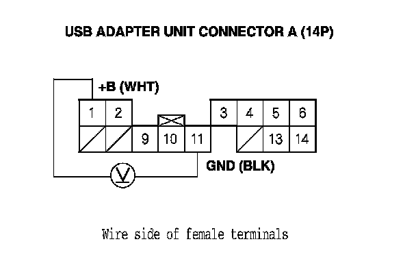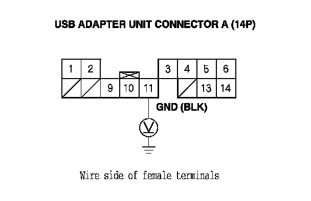 13. Measure the voltage between USB adapter unit connector A (14P) terminals No. 1 and No. 11.
