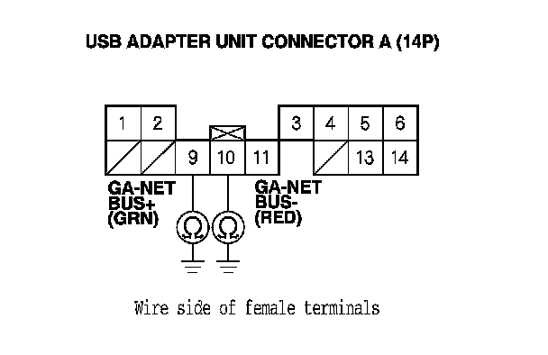 17. Check for continuity between body ground and USB adapter unit connector A (14P) terminals No. 9 and No. 10 individually.