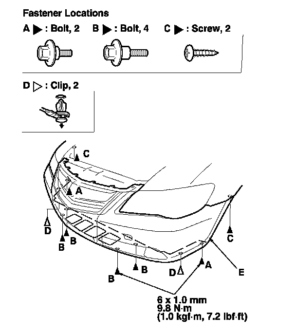 2. Remove the bolts (A, B), screws (C), and the clips (D) securing the front bumper (E).
