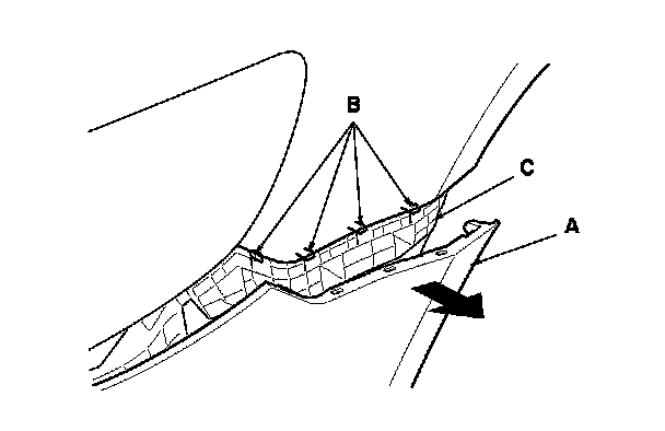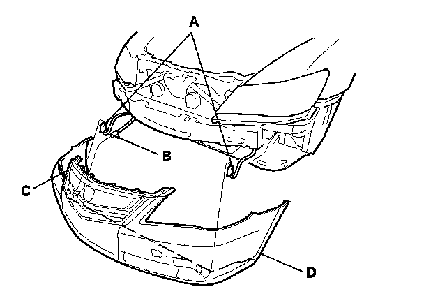 4. With the help of an assistant, pull the wheel arch portion away from the side spacer (A) while pulling the front bumper (B) to release the bumper from the hooks (C) on the corner upper beam (D).