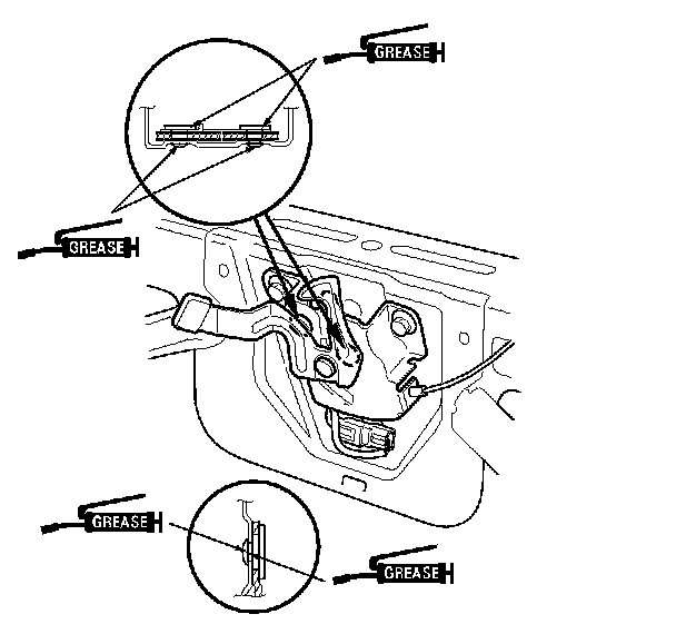 8. Apply multipurpose grease to the hood latch and hood hinges as indicated by the arrows.