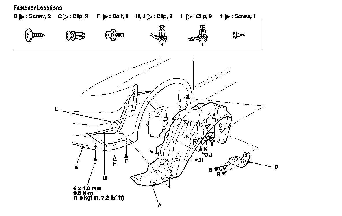 -3 From the wheel arch, remove the clips (I, J) and screw (K) securing the front inner fender (and splash shield) to the body.