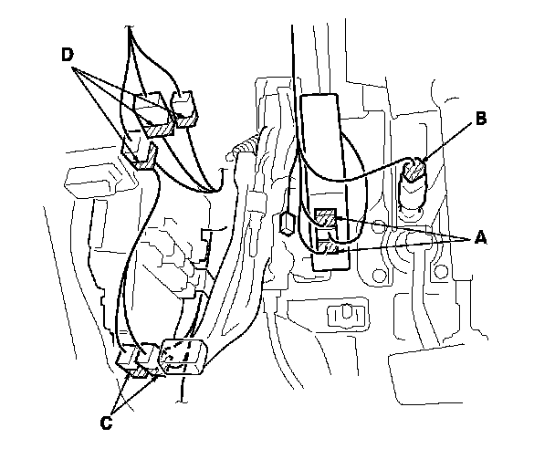 4. From under the dash, disconnect the keyless access control unit connectors (A), the brake switch connector (B), the left side wire harness connectors (C), the engine compartment wire harness connectors (D), and disconnect the dashboard wire harness connectors (E) and the combination subwire harness connector (F) from the driver's under-dash fuse/relay box (G), then release the wire harness clips.