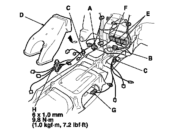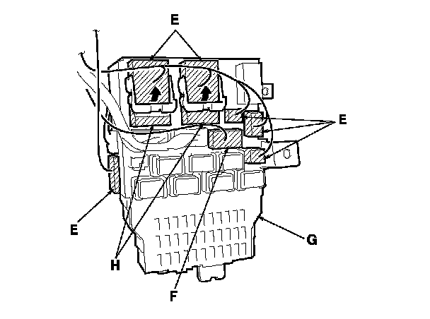 NOTE: Lift the white wire harness connector locks (H) before trying to remove the connectors from the fuse box.