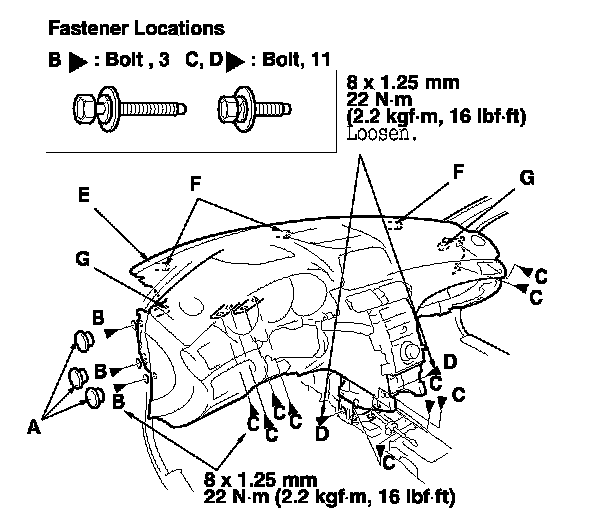 10. Open the driver's door, and remove the caps (A), then remove the bolts (B, C), loosen the two bolts (D), and lift up on the dashboard (E) to release it from the guide pins (F, G).