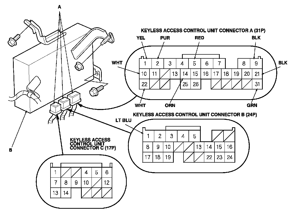 3. Disconnect the connectors (A) from the keyless access control unit (B).