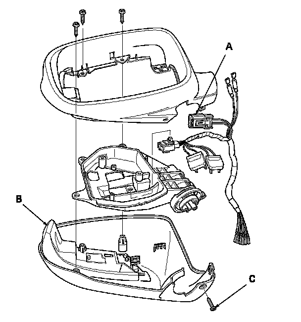 9. Remove the three TORX screws, and separate the mirror housing (B) from the bracket (C).