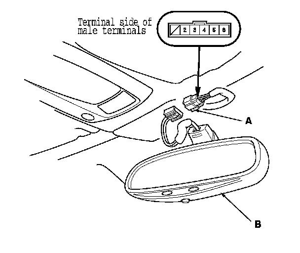 2. Disconnect the 6P connector (A) from the automatic dimming inside mirror (B).