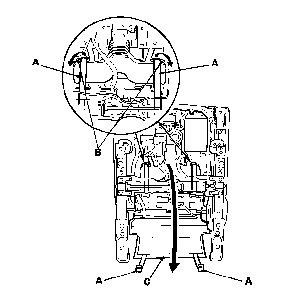 2. From under the seat cushion, release the hook strap (A) from the seat cushion frame springs (B), then pull the undercover (C) of the back cover.