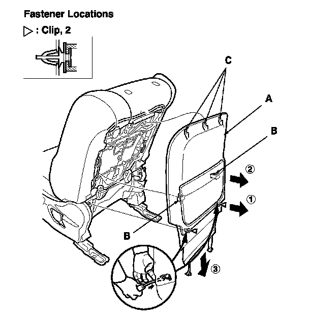 3. Insert a trim pad remover between the bottom of the back cover (A) and the seat frame until it squarely engages one of the clips. Gently pry on the clip until it detaches from the seat frame. Repeat for the other clip. Gently pull the back panel back to release the hooks (B), then pull the panel down to release the hooks (C).