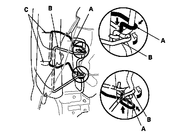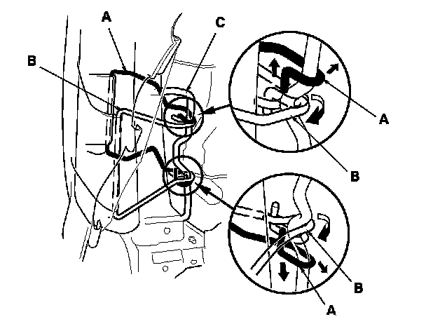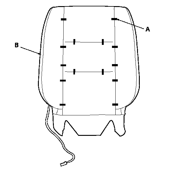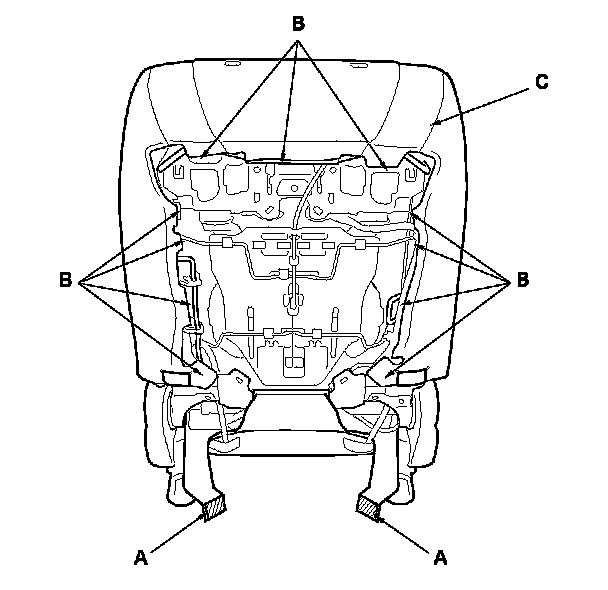 - Before installing the seat-back cover, make sure airbag attachment wires (A, B) are installed to the reinforcing cloths (C) correctly, and wires A and B are securely assembled.