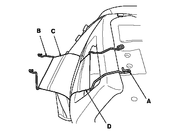 14. Remove airbag attachment wire B from the outside reinforcing cloths (C). Remove airbag attachment wire A and the inside reinforcing cloths (D), then remove the wires.