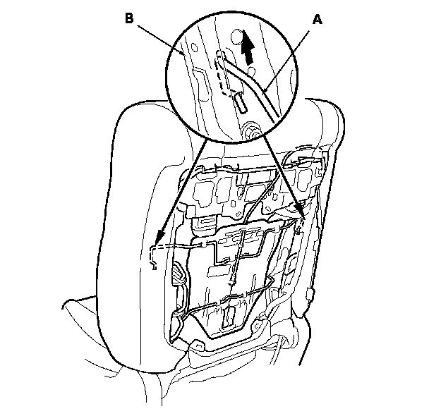 4. Release the upper wire (A) from both seat-back side frames (B) of inside the seat-back.