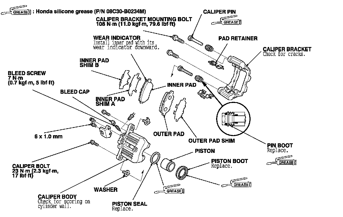 Remove, disassemble, inspect, reassemble, and install the caliper, and note these items: