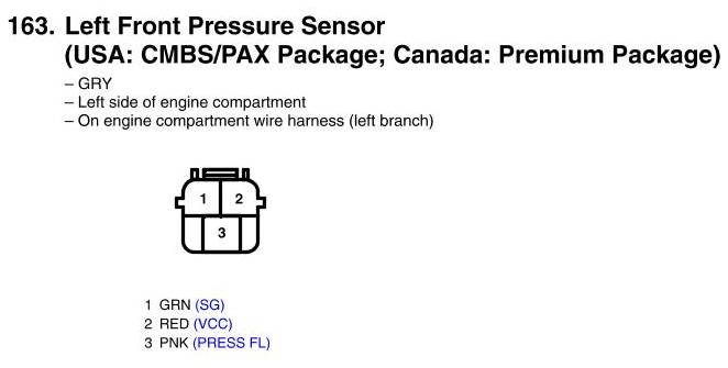 Left Front Pressure Sensor Connector View (USA: CMBS/PAX Package; Canada: Premium Package)