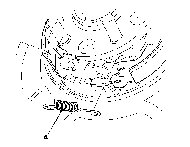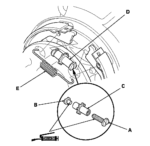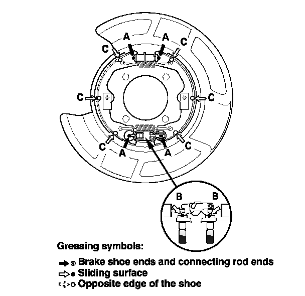 1. Apply Molykote 44MA grease to the shoe ends and connecting rod ends (A), sliding surfaces (B), and opposite edges of the parking brake shoe (C) as shown. Wipe off any excess. Keep grease off the brake linings.