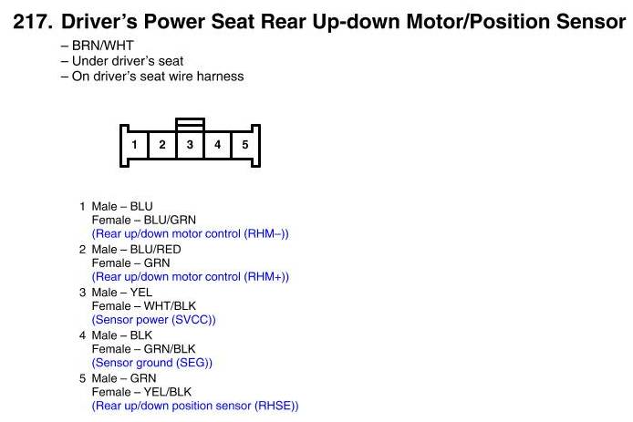 View 217 - Driver's Power Seat Rear Up-Down Motor/Position Sensor Connector View