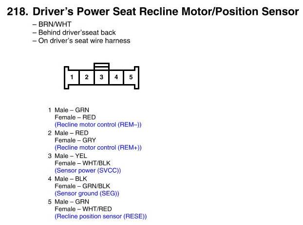 View 218 - Driver's Power Seat Recline Motor/Position Sensor Connector View