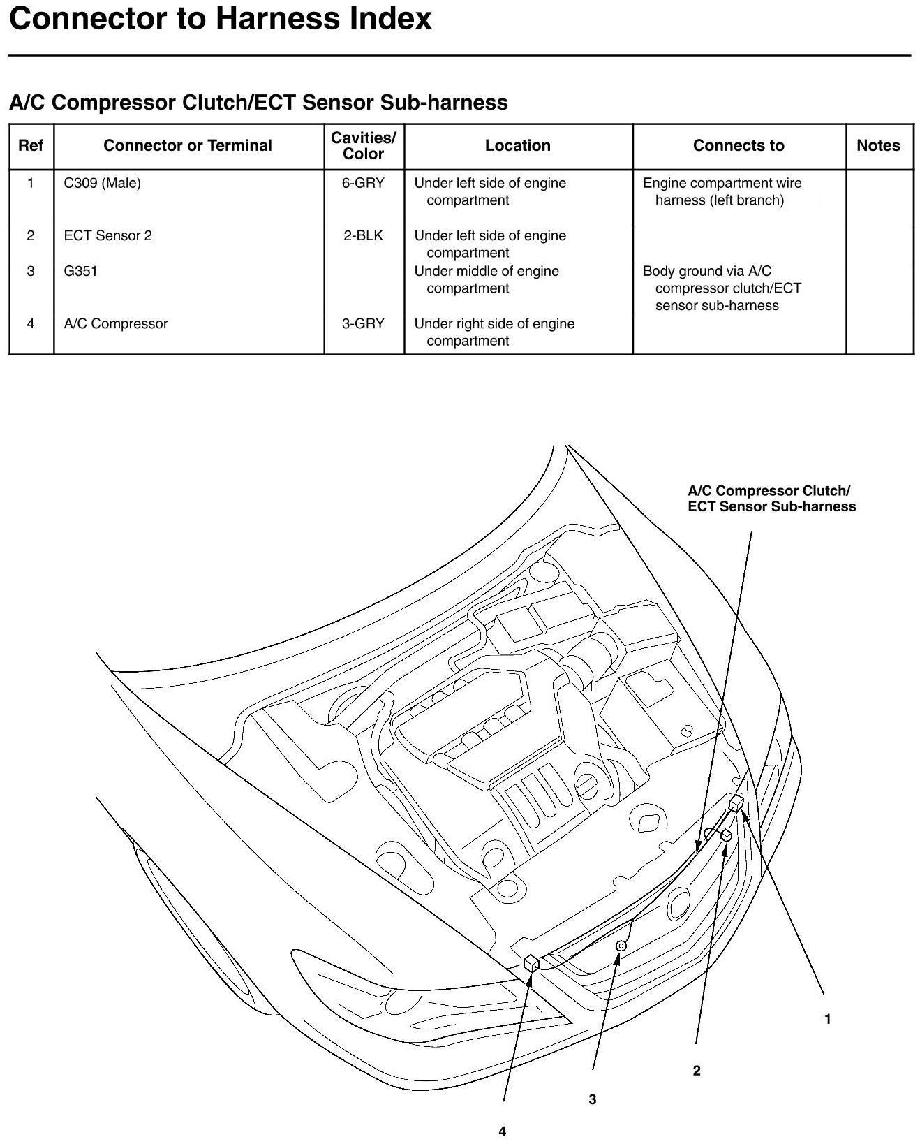 A/C Compressor/ECT Sensor Subharness Connector And Harness Locations