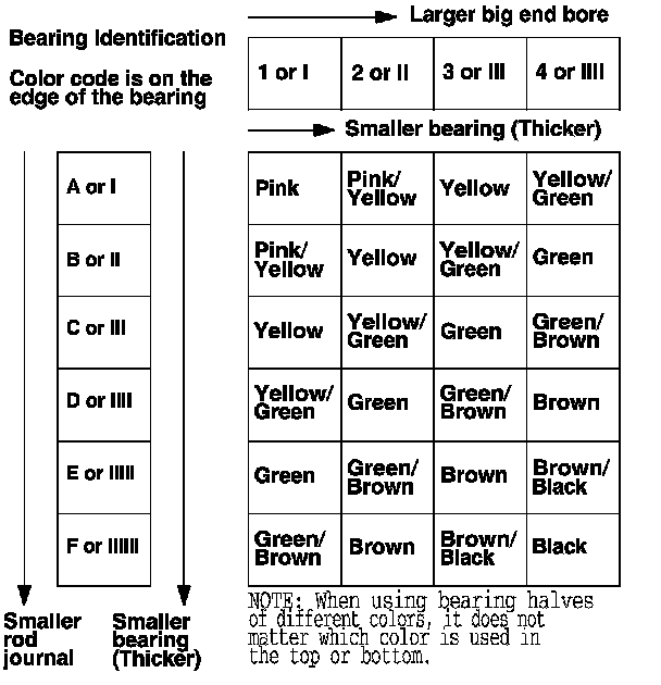 Numbers or bars have been stamped on the side of each connecting rod as a code for the size of the big end. Use them, and the letters or bars stamped on the crank (codes for rod journal size) to choose the correct bearings. If the codes are indecipherable because of an accumulation of dirt and dust, do not scrub them with a wire brush or scraper. Clean them only with solvent or detergent.