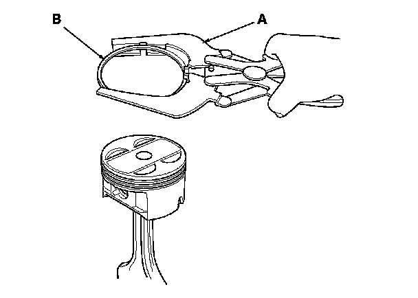 2. Using a ring expander (A), remove the old piston rings (B).