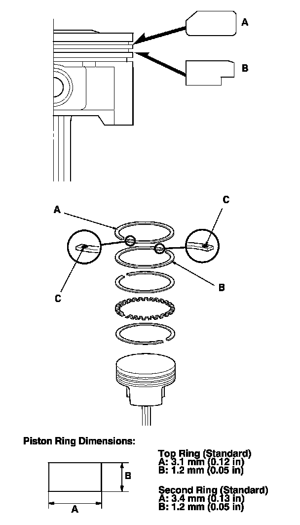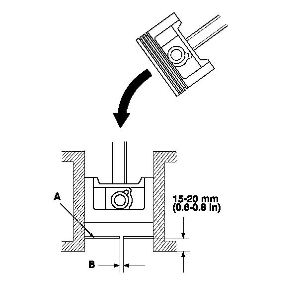 5. Measure the piston ring end-gap (B) with a feeler gauge: