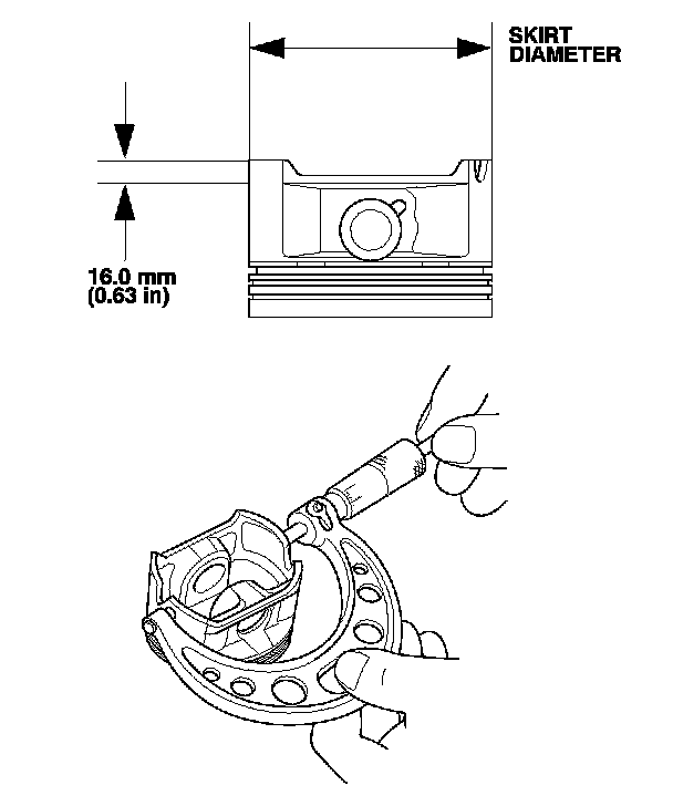 3. Measure the piston diameter at a point 16.0 mm (0.63 in) from the bottom of the skirt.