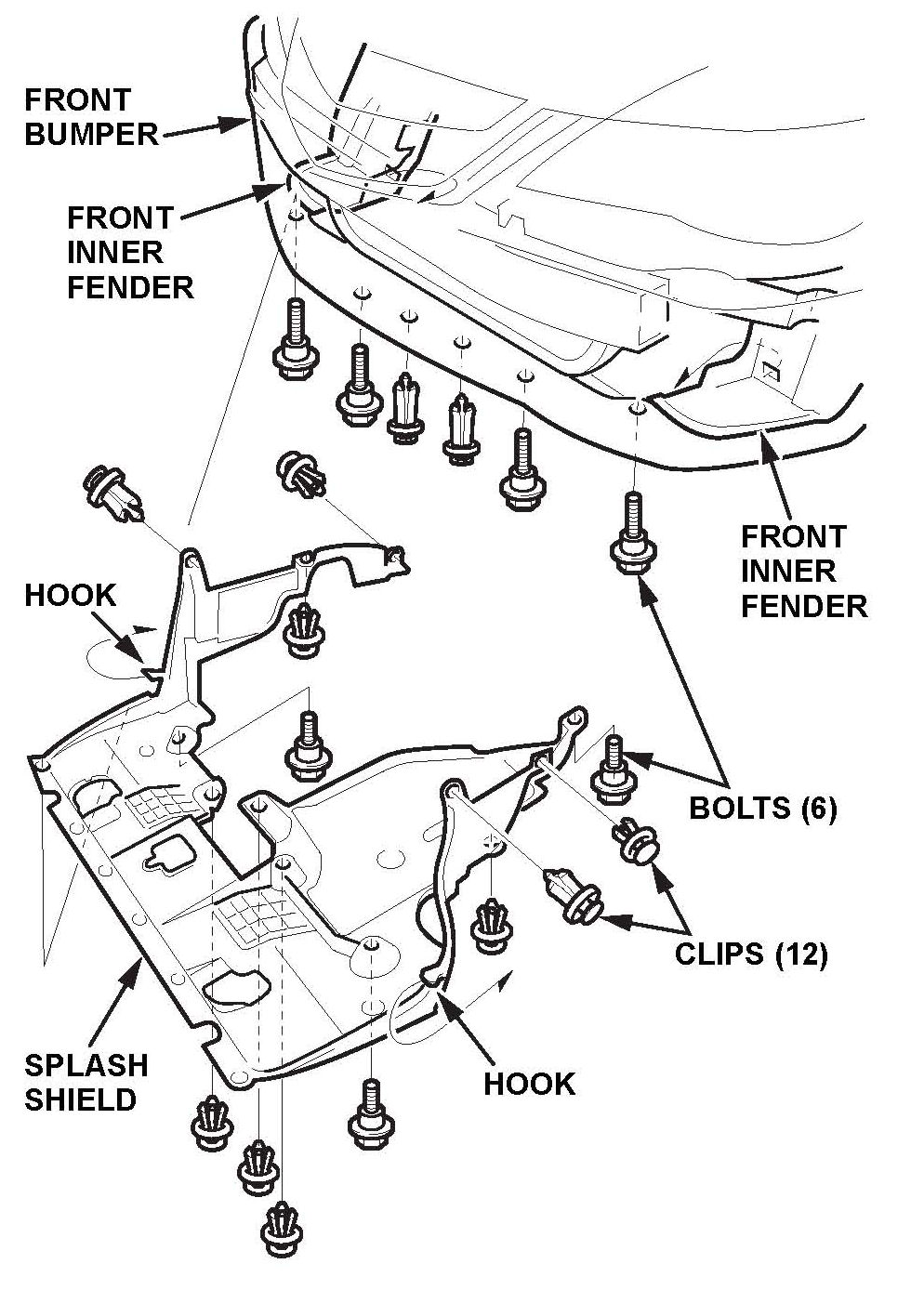 ^ Remove the clips that secure the front inner fender and the splash shield to the body.