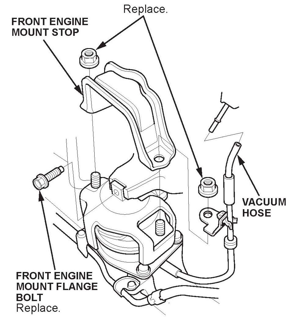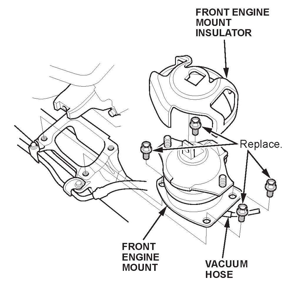 16. Remove the front engine mount insulator, then disconnect the vacuum hose.
