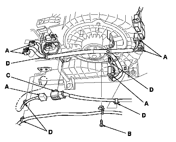 10. Disconnect the connectors (A) from the blower motor, the power transistor, the control motor relay, the throttle actuator control module subharness, and the dashboard wire harnesses. Remove the self-tapping screw (B), the connector clip (C) and the wire harness clips (D).