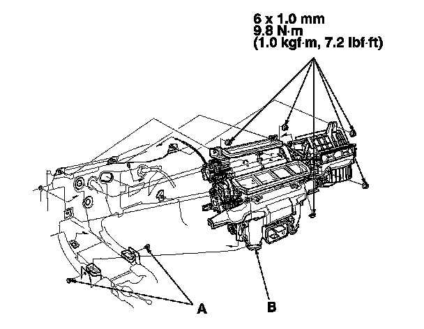 9. Disconnect the connectors (A) from the driver's cool vent control motor, the driver's air mix control motor, the mode control motor, and the evaporator temperature sensor, then remove the wire harness clips (B).