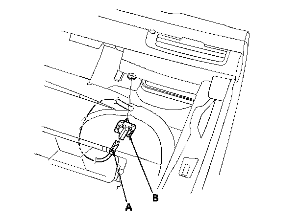 2. Disconnect the connector (A) from the passenger's vent air temperature sensor. Remove the passenger's vent air temperature sensor (B).