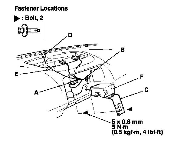 5. Disconnect the RF unit connector (A) and detach the harness clip (B) from the unit bracket (C). Tie a string to the sunlight sensor harness connector (D), then pull the connector out through the hole (E) in the dashboard. Remove the bolts, then remove the RF unit (F).