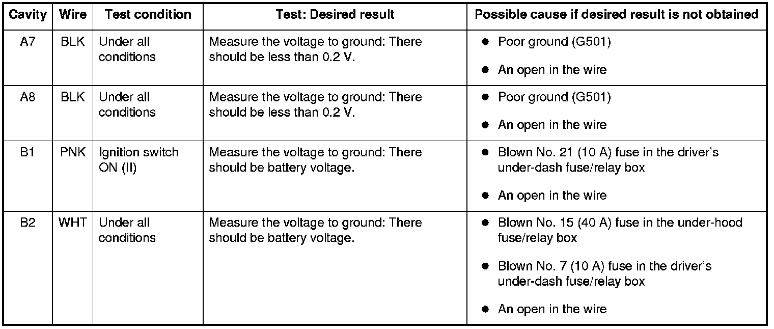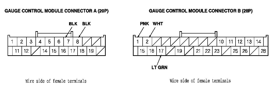 6. Disconnect gauge control module connectors A (20P) and B (28P), and do these input tests at the following connector.