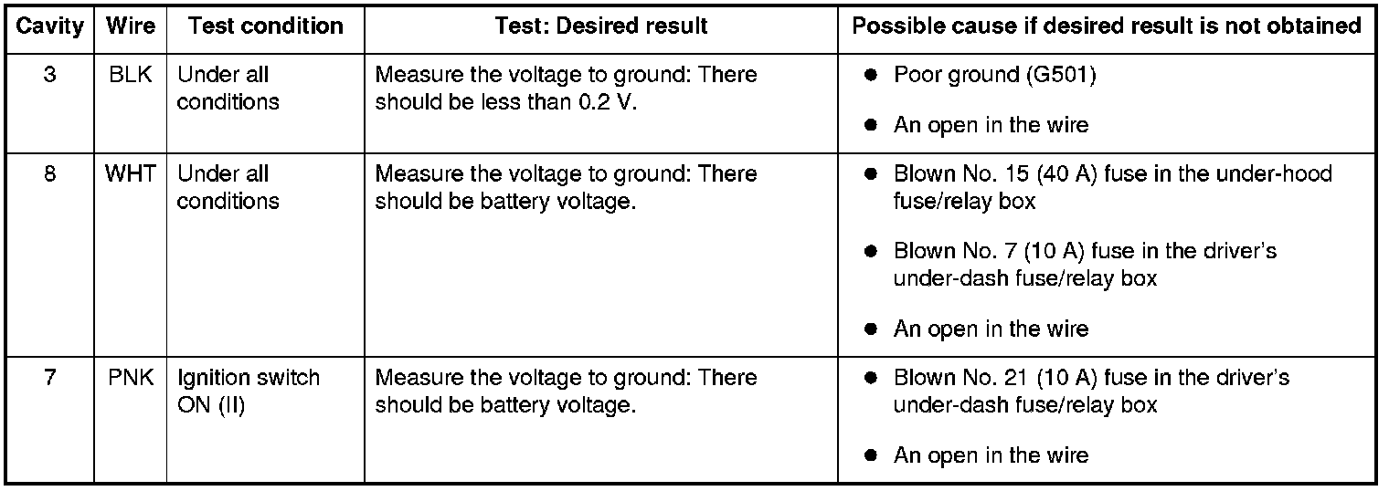 4. Reconnect the connector to the wiper/washer switch, and do these input tests at the following connector.