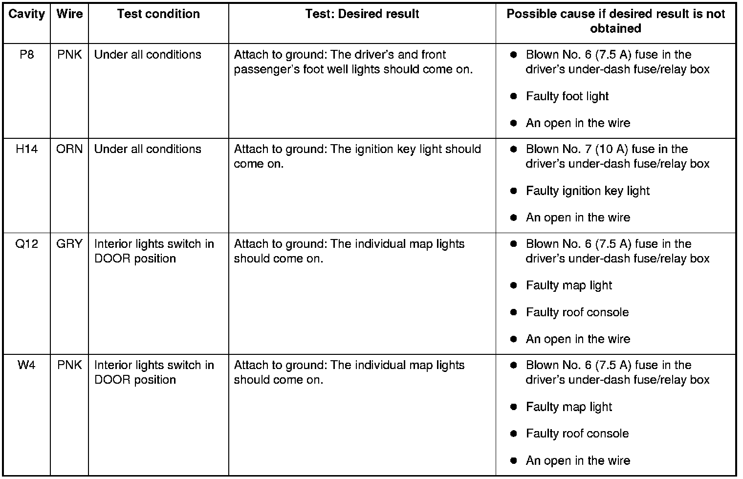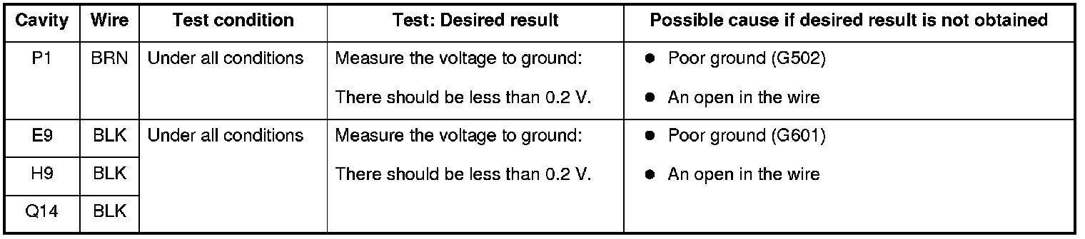 6. Reconnect the connectors to the driver's under-dash fuse/relay box, and do these input tests at the following connectors.