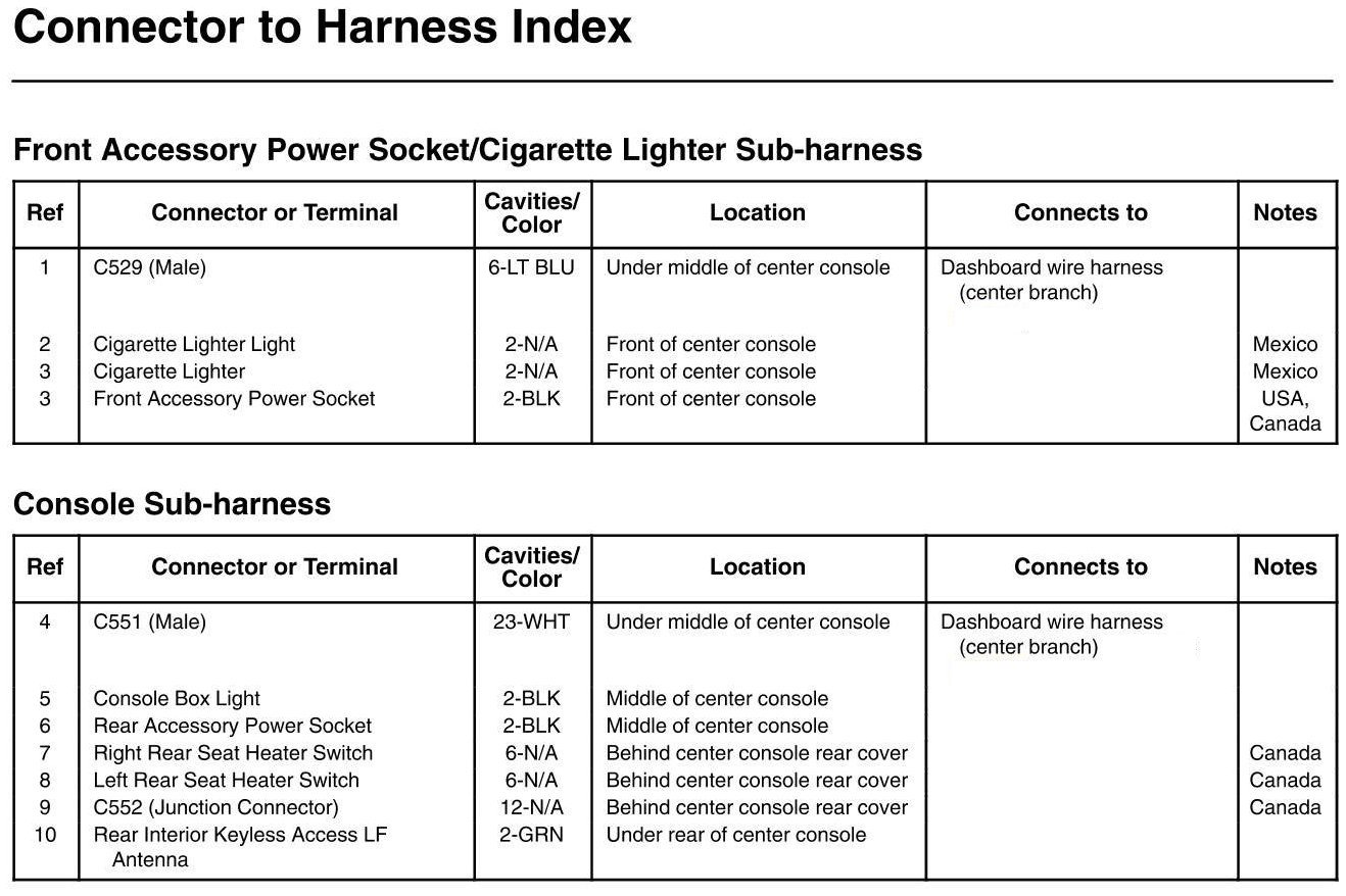 Front Accessory Power Socket/Cigarette Lighter Subharness And Console Subharness Connector And Harness Locations