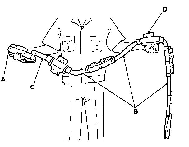 To release the lock, pull the spring-loaded sleeve (A) toward the stop (B) while holding the opposite half of the connector. Then pull the connector halves apart. Be sure to pull on the sleeve and not on the connector.