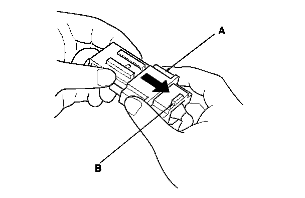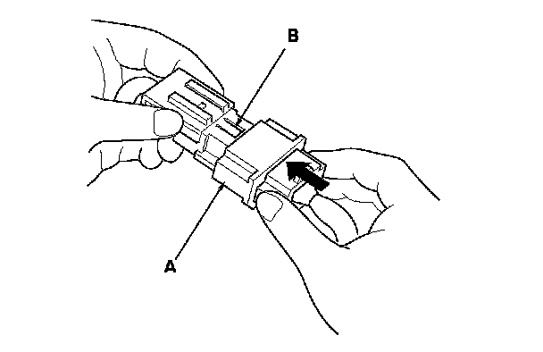 1. To reconnect, hold the pawl-side connector, and press on the back of the sleeve-side connector in the direction shown. As the two connector halves are pressed together, the sleeve (A) is pushed back by the pawl (B). Do not touch the sleeve.